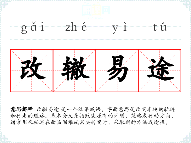 改辙易途 是一个汉语成语,字面意思是改变车轮的轨迹和行走的道路。基本含义是指改变原有的计划、策略或行动方向,通常用来描述在面临困难或需要转变时,采取新的方法或途径。