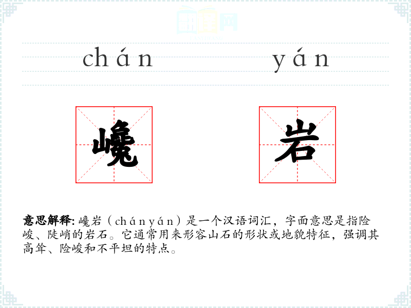 巉岩(chán yán)是一个汉语词汇,字面意思是指险峻、陡峭的岩石。它通常用来形容山石的形状或地貌特征,强调其高耸、险峻和不平坦的特点。