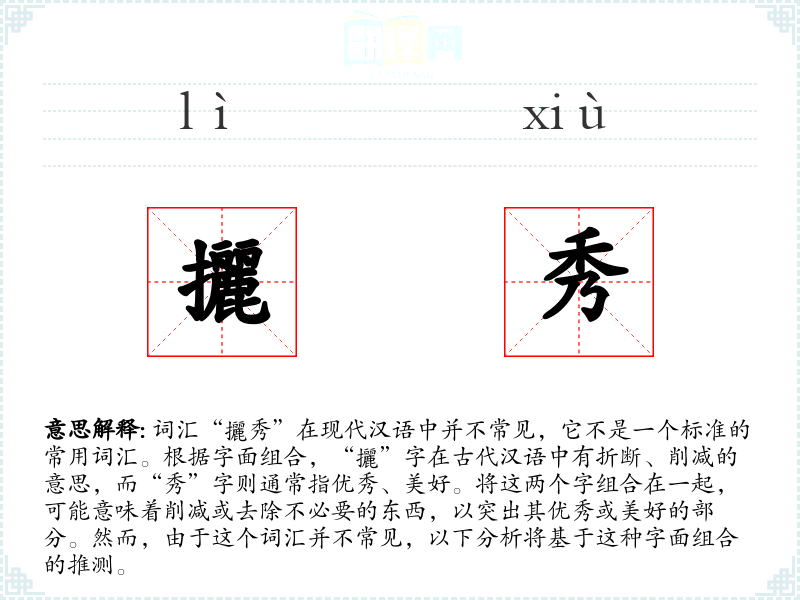 词汇“攦秀”在现代汉语中并不常见,它不是一个标准的常用词汇。根据字面组合,“攦”字在古代汉语中有折断、削减的意思,而“秀”字则通常指优秀、美好。将这两个字组合在一起,可能意味着削减或去除不必要的东西,以突出其优秀或美好的部分。然而,由于这个词汇并不常见,以下分析将基于这种字面组合的推测。