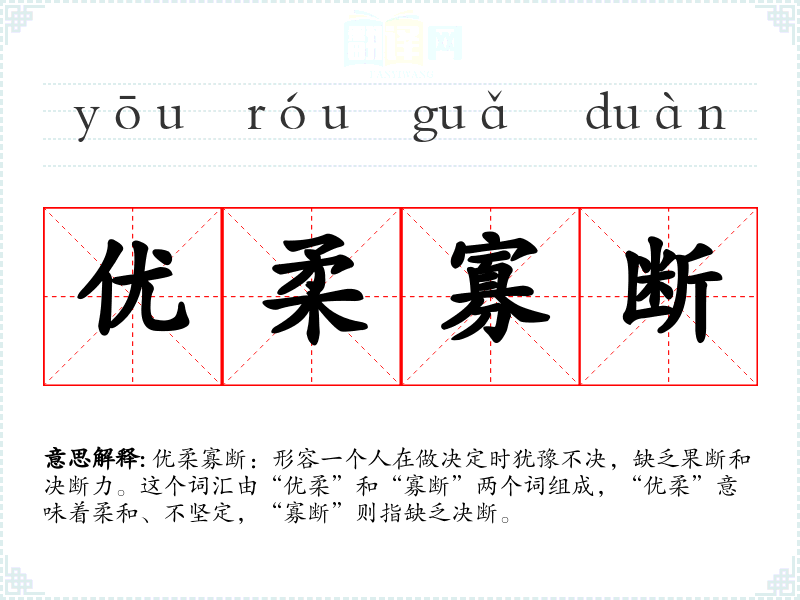 优柔寡断:形容一个人在做决定时犹豫不决,缺乏果断和决断力。这个词汇由“优柔”和“寡断”两个词组成,“优柔”意味着柔和、不坚定,“寡断”则指缺乏决断。