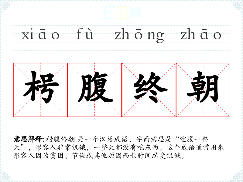 枵腹终朝 是一个汉语成语,字面意思是“空腹一整天”,形容人非常饥饿,一整天都没有吃东西。这个成语通常用来形容人因为贫困、节俭或其他原因而长时间忍受饥饿。