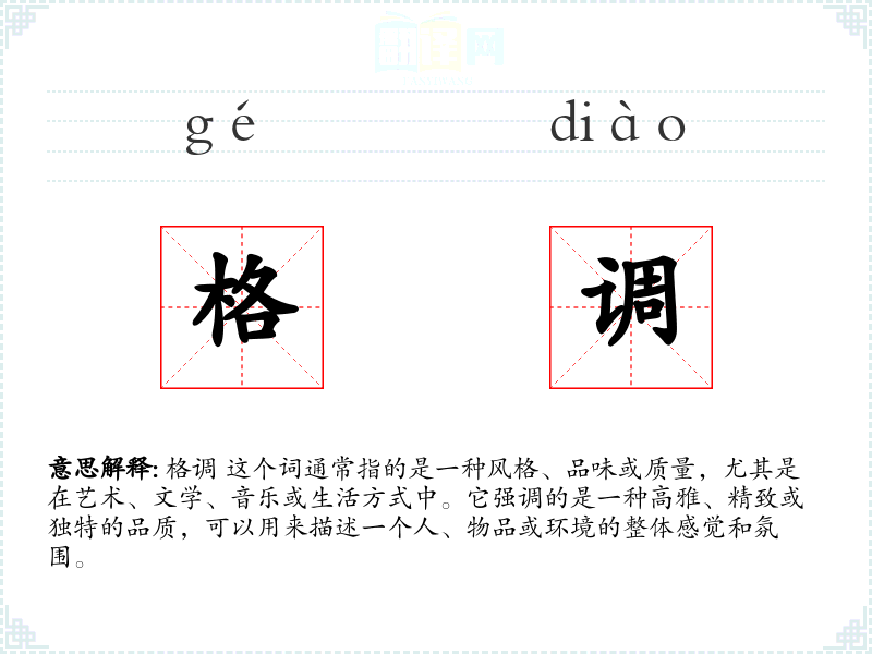格调 这个词通常指的是一种风格、品味或质量,尤其是在艺术、文学、音乐或生活方式中。它强调的是一种高雅、精致或独特的品质,可以用来描述一个人、物品或环境的整体感觉和氛围。