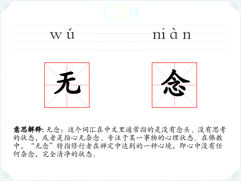 "无念"的意思解释、无念是什么意思由翻译网汉语词典查词提供。