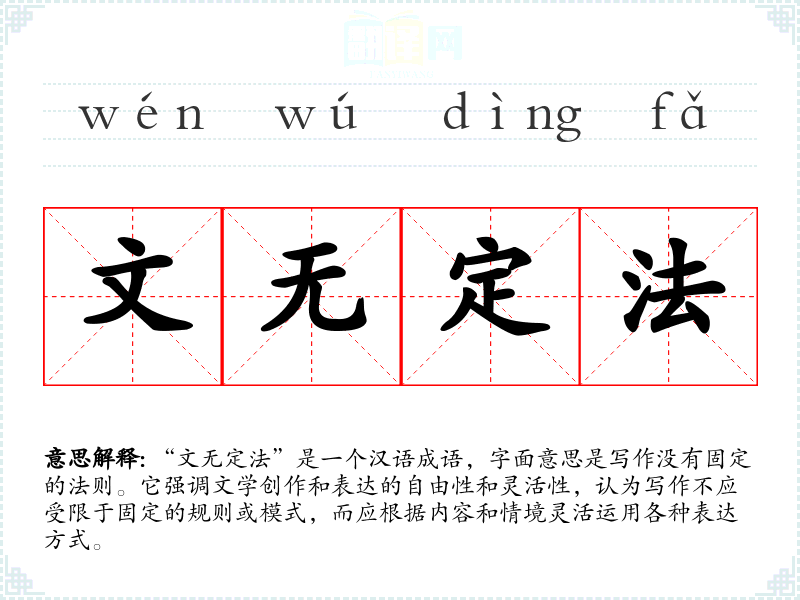 “文无定法”是一个汉语成语,字面意思是写作没有固定的法则。它强调文学创作和表达的自由性和灵活性,认为写作不应受限于固定的规则或模式,而应根据内容和情境灵活运用各种表达方式。