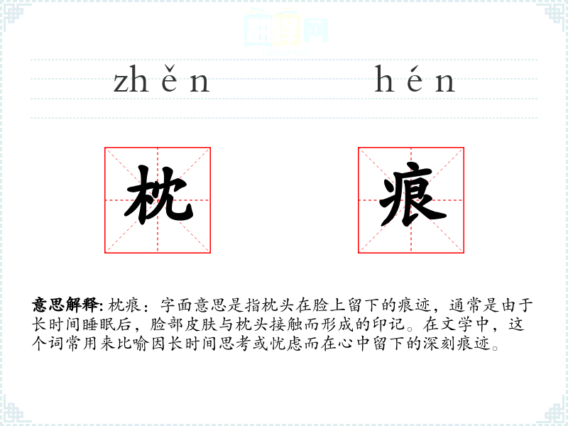 枕痕:字面意思是指枕头在脸上留下的痕迹,通常是由于长时间睡眠后,脸部皮肤与枕头接触而形成的印记。在文学中,这个词常用来比喻因长时间思考或忧虑而在心中留下的深刻痕迹。