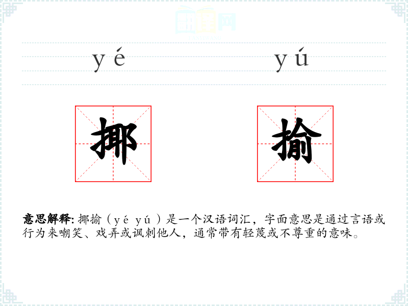 揶揄(yé yú)是一个汉语词汇,字面意思是通过言语或行为来嘲笑、戏弄或讽刺他人,通常带有轻蔑或不尊重的意味。