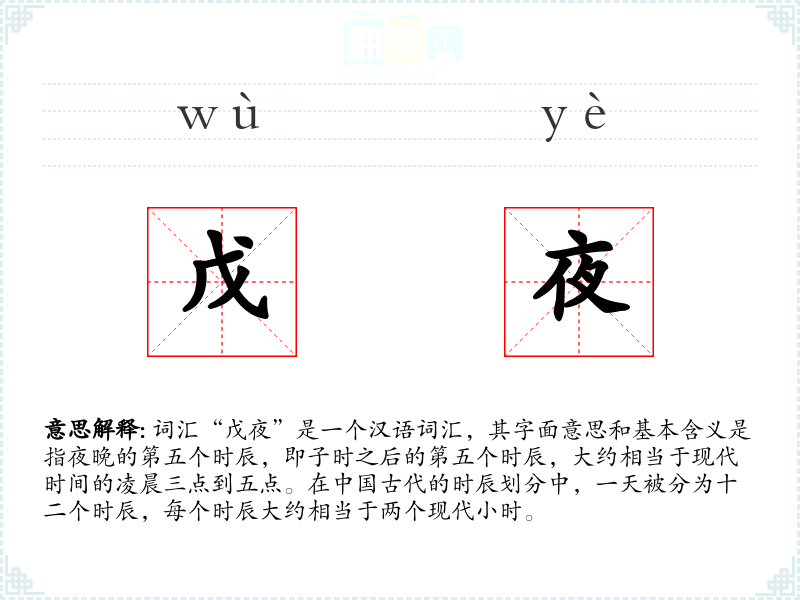 词汇“戊夜”是一个汉语词汇,其字面意思和基本含义是指夜晚的第五个时辰,即子时之后的第五个时辰,大约相当于现代时间的凌晨三点到五点。在**古代的时辰划分中,一天被分为十二个时辰,每个时辰大约相当于两个现代小时。
