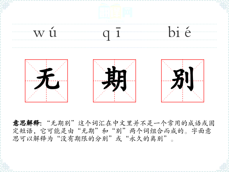 “无期别”这个词汇在中文里并不是一个常用的成语或固定短语,它可能是由“无期”和“别”两个词组合而成的。字面意思可以解释为“没有期限的分别”或“永久的离别”。