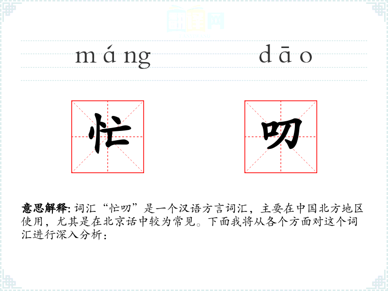 词汇“忙叨”是一个汉语方言词汇,主要在**北方地区使用,尤其是在北京话中较为常见。下面我将从各个方面对这个词汇进行深入分析: