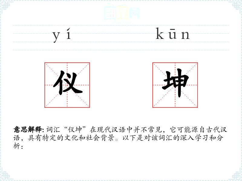 词汇“仪坤”在现代汉语中并不常见,它可能源自古代汉语,具有特定的文化和社会背景。以下是对该词汇的深入学*和分析: