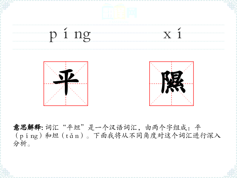 词汇“平坦”是一个汉语词汇,由两个字组成:平(píng)和坦(tǎn)。下面我将从不同角度对这个词汇进行深入分析。