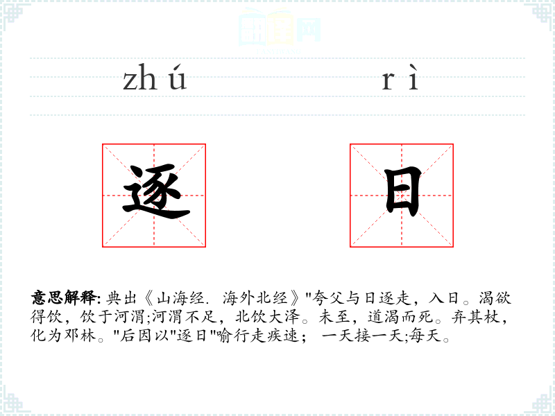 典出《山海经.海外北经》"夸父与日逐走,入日。渴欲得饮,饮于河渭;河渭不足,北饮大泽。未至,道渴而死。弃其杖,化为邓林。"后因以"逐日"喻行走疾速; 一天接一天;每天。