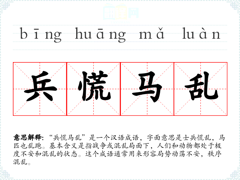在英语中,类似的表达可能是“chaos and confusion”,虽然不如“兵慌马乱”那样形象生动,但也传达了混乱无序的状态。