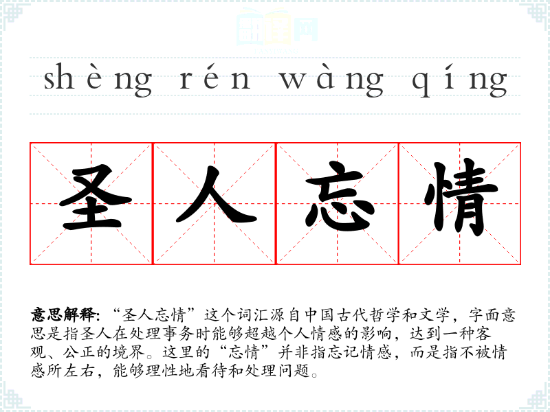 “圣人忘情”这个词汇源自**古代哲学和文学,字面意思是指圣人在处理事务时能够超越个人情感的影响,达到一种客观、公正的境界。这里的“忘情”并非指忘记情感,而是指不被情感所左右,能够理性地看待和处理问题。