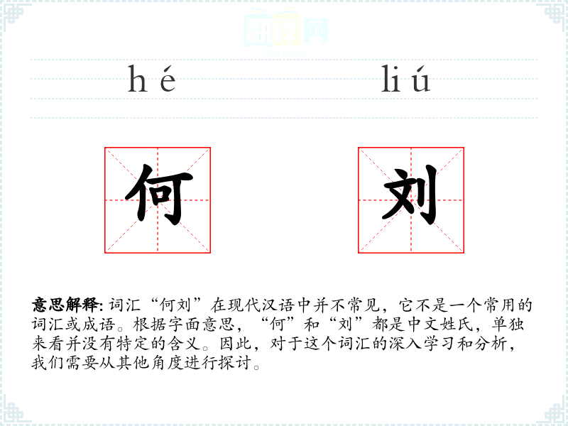 词汇“何刘”在现代汉语中并不常见,它不是一个常用的词汇或成语。根据字面意思,“何”和“刘”都是中文姓氏,单独来看并没有特定的含义。因此,对于这个词汇的深入学*和分析,我们需要从其他角度进行探讨。