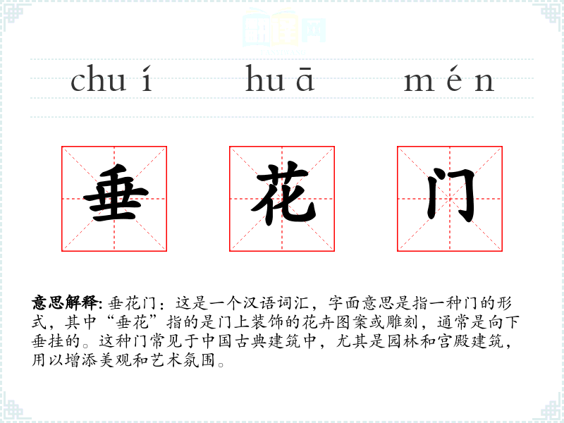 总结:垂花门不仅是一种建筑装饰,更是古典文化和艺术的象征。它承载了丰富的历史和文化信息,是了解和欣赏传统建筑的重要窗口。 反思:在语言学*和表达中,了解和运用这样的词汇,能够丰富我们的语言表达,增加文化的深度和广度。