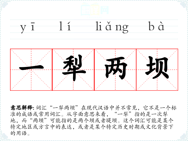 词汇“一犁两坝”在现代汉语中并不常见,它不是一个标准的成语或常用词汇。从字面意思来看,“一犁”指的是一次犁地,而“两坝”可能指的是两个坝或者堤坝。这个词汇可能是某个特定地区或方言中的表达,或者是某个特定历史时期或文化背景下的用语。