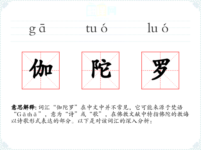 词汇“伽陀罗”在中文中并不常见,它可能来源于梵语“Gāthā”,意为“诗”或“歌”,在**文献中特指佛陀的教诲以诗歌形式表达的部分。以下是对该词汇的深入分析: