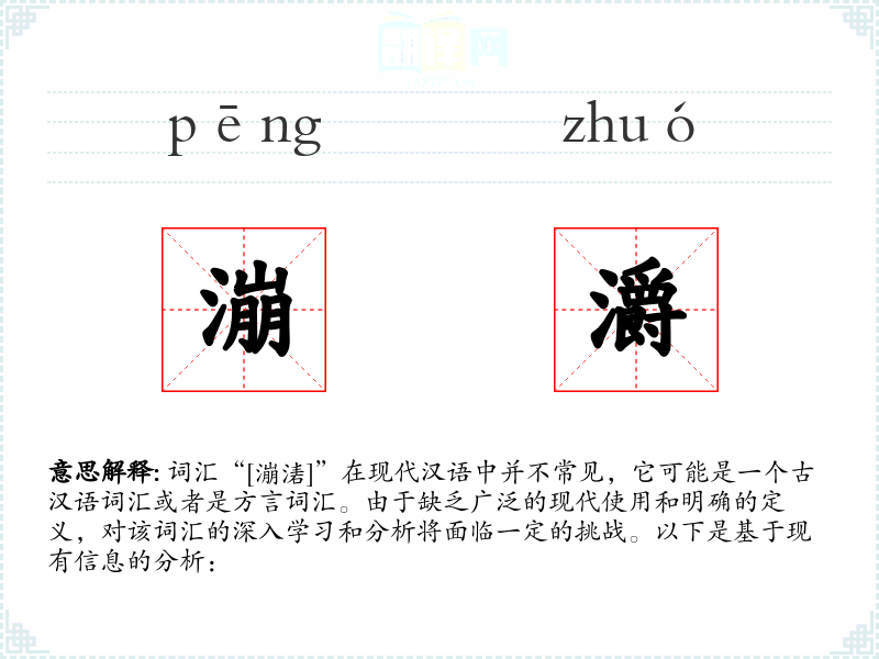 由于“漰湱”不是一个标准的现代汉语词汇,我们无法提供一个确切的基本定义。它可能是由两个汉字组成的复合词,每个字在古汉语中可能有其特定的含义,但组合在一起的含义不明确。