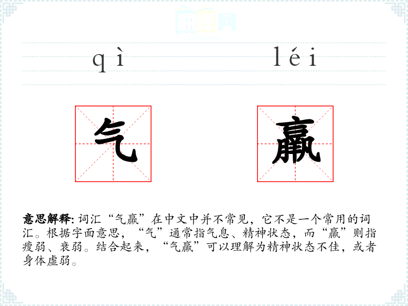 - 词源:“气”和“羸”都是古代汉语中的词汇,组合起来形成新的词汇。