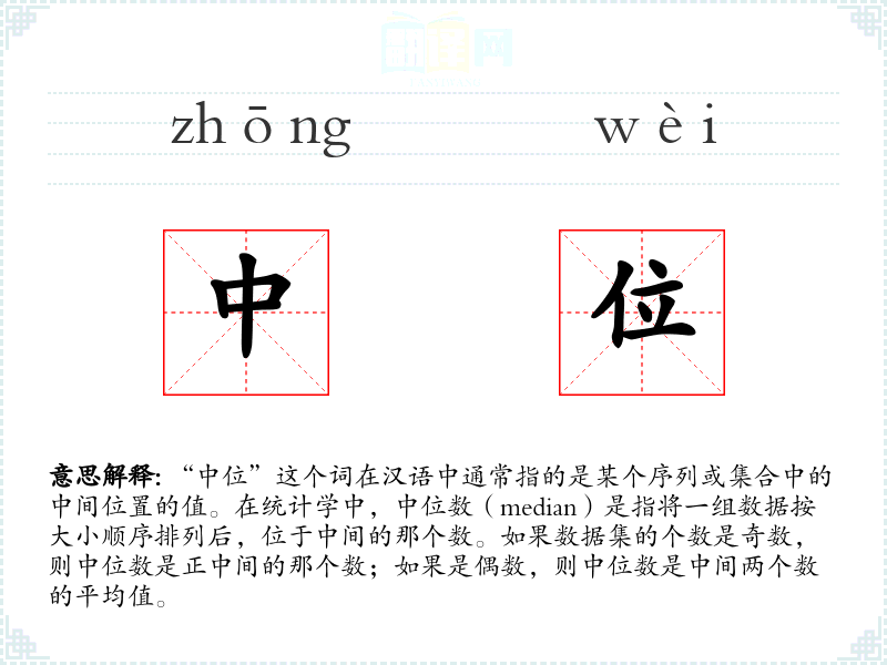 - 专业领域:在数学和统计学中,“中位”是一个重要的概念,用于描述数据的集中趋势,与平均数(mean)和众数(mode)并列。