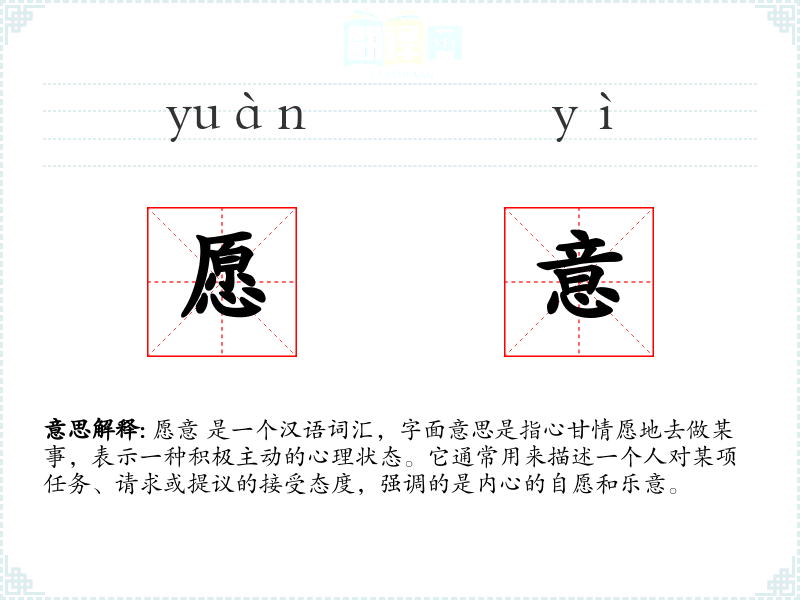 愿意 是一个汉语词汇,字面意思是指心甘情愿地去做某事,表示一种积极主动的心理状态。它通常用来描述一个人对某项任务、请求或提议的接受态度,强调的是内心的自愿和乐意。