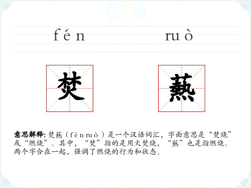 焚爇(fén ruò)是一个汉语词汇,字面意思是“焚烧”或“燃烧”。其中,“焚”指的是用火焚烧,“爇”也是指燃烧。两个字合在一起,强调了燃烧的行为和状态。
