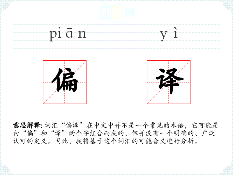 词汇“偏译”在中文中并不是一个常见的术语,它可能是由“偏”和“译”两个字组合而成的,但并没有一个明确的、广泛认可的定义。因此,我将基于这个词汇的可能含义进行分析。