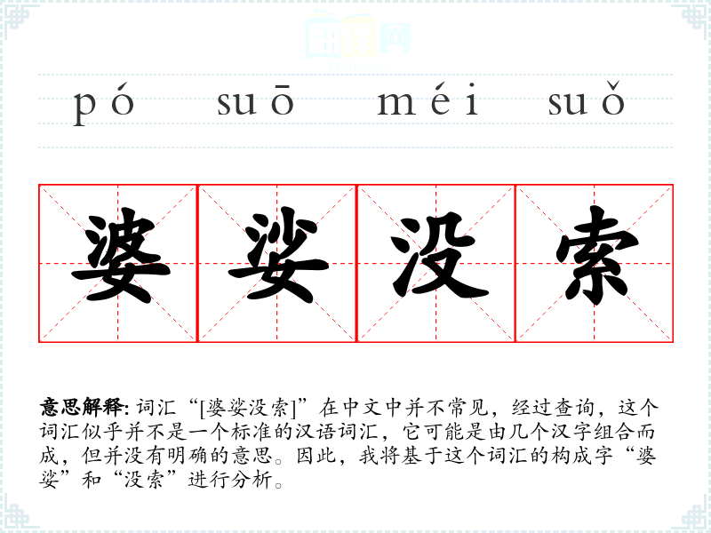 词汇“[婆娑没索]”在中文中并不常见,经过查询,这个词汇似乎并不是一个标准的汉语词汇,它可能是由几个汉字组合而成,但并没有明确的意思。因此,我将基于这个词汇的构成字“婆娑”和“没索”进行分析。