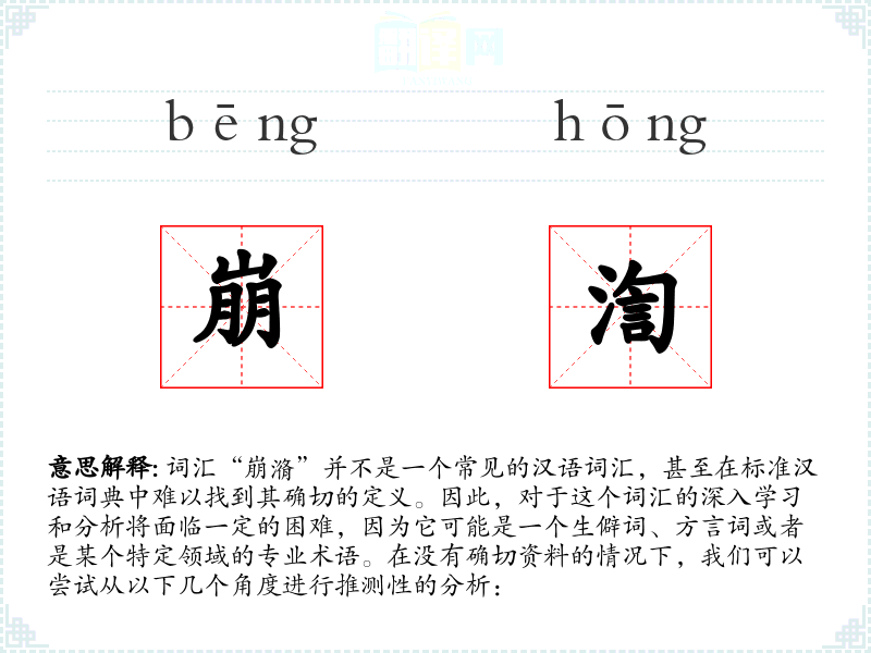 由于缺乏确切资料,我们无法给出“崩潃”的确切字面意思和基本含义。它可能是由“崩”和“潃”两个字组合而成的复合词,其中“崩”通常指物体破裂或崩溃,而“潃”则不是一个常用字,可能需要查阅更专业的词典或资料来确定其含义。