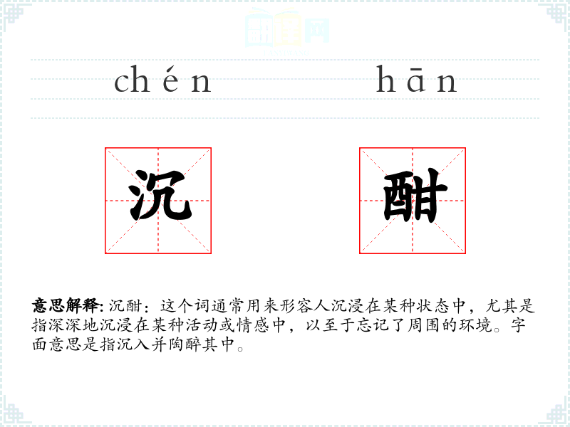 沉酣:这个词通常用来形容人沉浸在某种状态中,尤其是指深深地沉浸在某种活动或情感中,以至于忘记了周围的环境。字面意思是指沉入并陶醉其中。