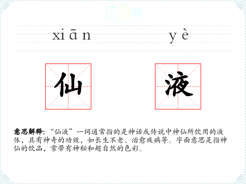 - 文学:在古典文学中,“仙液”常出现在描述仙境或神仙生活的篇章中,如《西游记》中提到的“仙酒”、“仙丹”等。