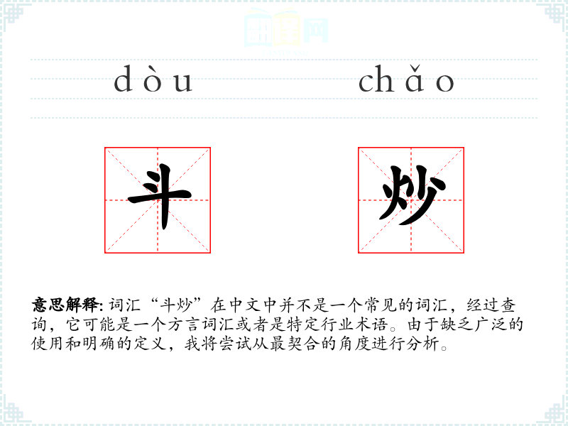 由于“斗炒”不是一个标准汉语词汇,我们无法给出确切的字面意思和基本含义。它可能是某个地方方言中的词汇,或者是特定行业(如餐饮业)的术语。