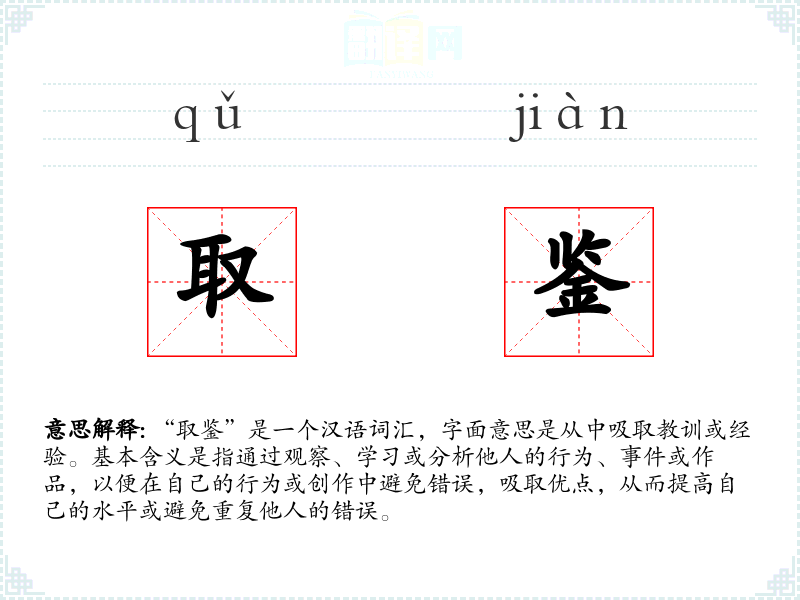 在英语中,“取鉴”可以对应为“learn from”或“draw lessons from”,虽然在表达上有所不同,但核心概念都是通过学*他人的经验来提升自己。