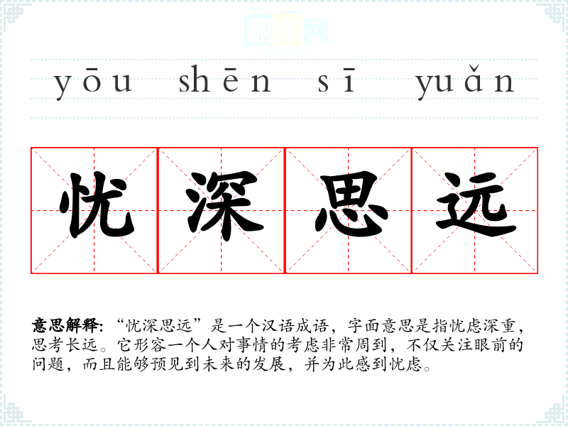 “忧深思远”是一个汉语成语,字面意思是指忧虑深重,思考长远。它形容一个人对事情的考虑非常周到,不仅关注眼前的问题,而且能够预见到未来的发展,并为此感到忧虑。