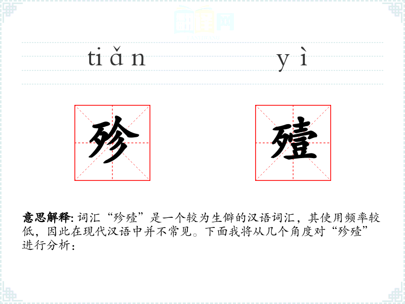 词汇“殄殪”是一个较为生僻的汉语词汇,其使用频率较低,因此在现代汉语中并不常见。下面我将从几个角度对“殄殪”进行分析: