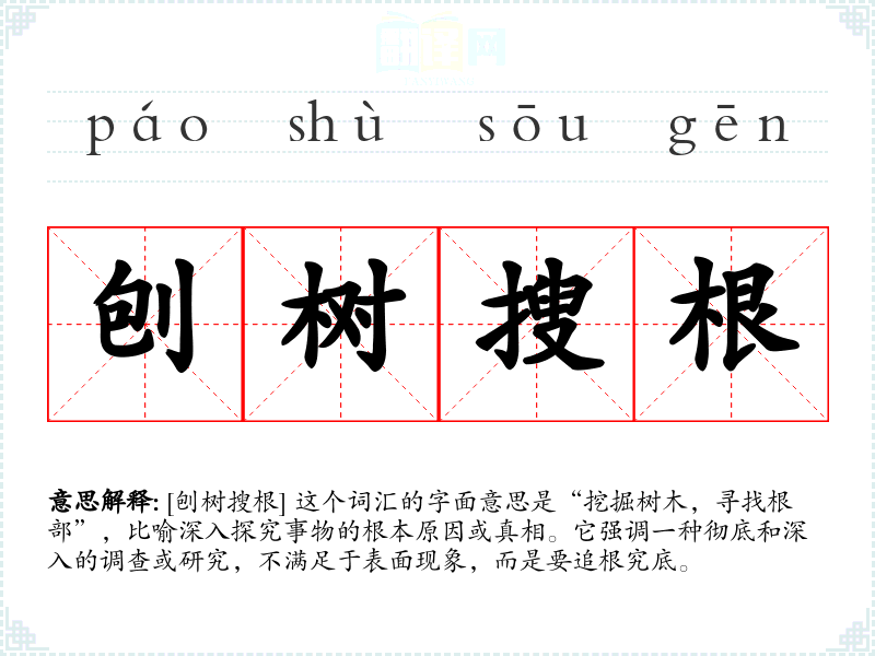 [刨树搜根] 这个词汇的字面意思是“挖掘树木,寻找根部”,比喻深入探究事物的根本原因或真相。它强调一种彻底和深入的调查或研究,不满足于表面现象,而是要追根究底。