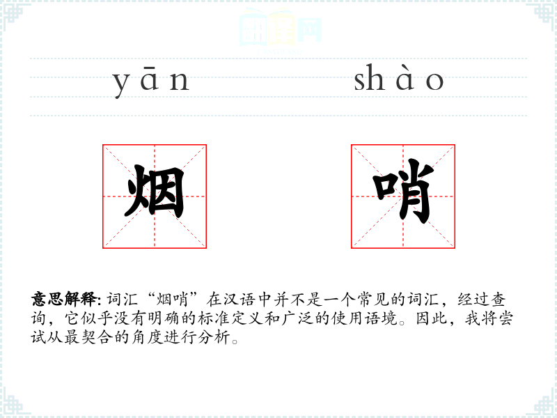 由于“烟哨”不是一个标准词汇,我们无法给出一个确切的字面意思和基本含义。它可能是由“烟”和“哨”两个词组合而成的,但具体含义不明。