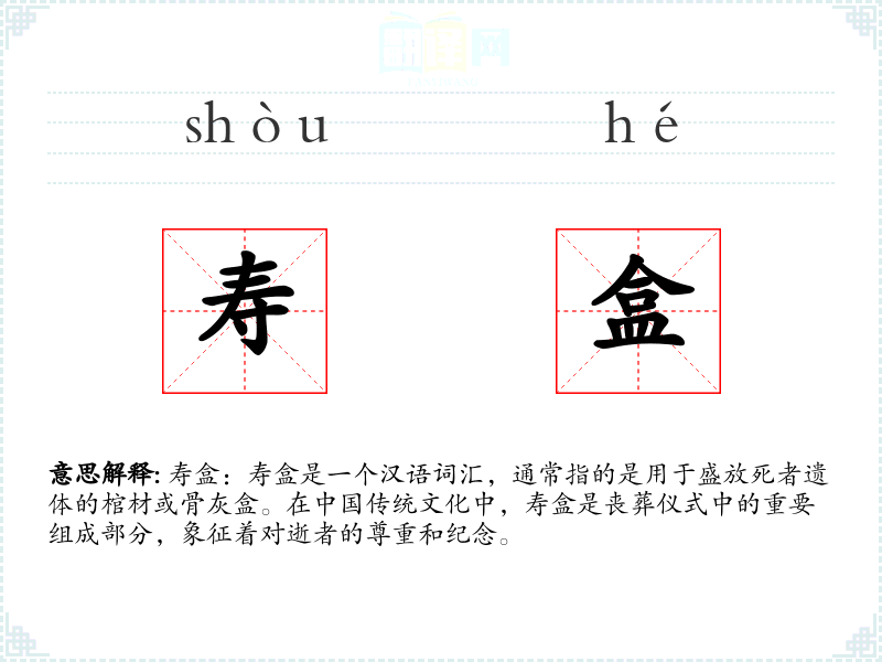 寿盒:寿盒是一个汉语词汇,通常指的是用于盛放死者遗体的棺材或骨灰盒。在**传统文化中,寿盒是丧葬仪式中的重要组成部分,象征着对逝者的尊重和纪念。