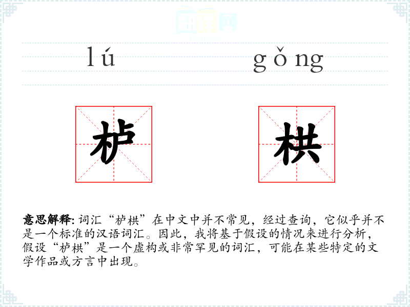 词汇“栌栱”在中文中并不常见,经过查询,它似乎并不是一个标准的汉语词汇。因此,我将基于假设的情况来进行分析,假设“栌栱”是一个虚构或非常罕见的词汇,可能在某些特定的文学作品或方言中出现。