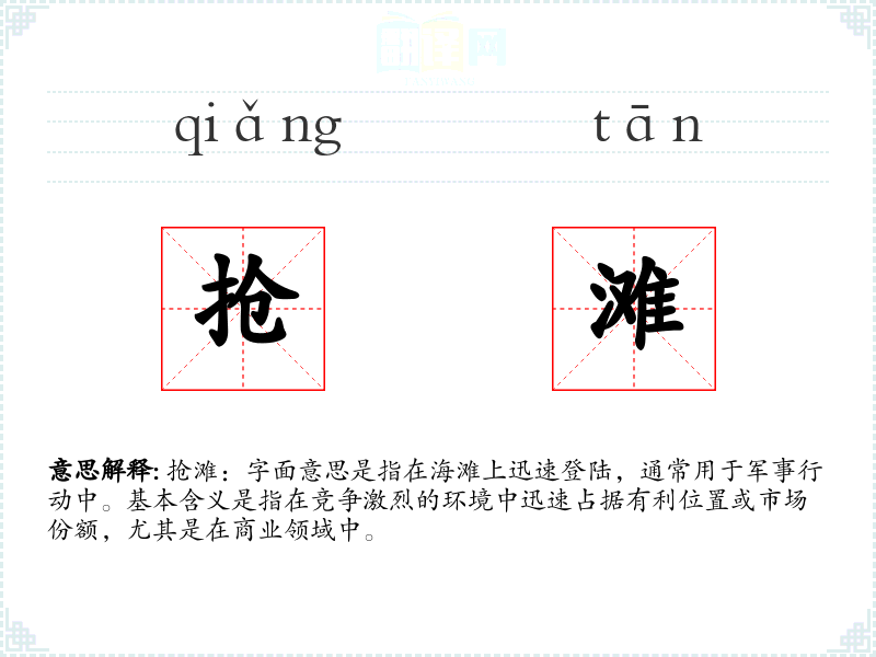 抢滩:字面意思是指在海滩上迅速登陆,通常用于军事行动中。基本含义是指在竞争激烈的环境中迅速占据有利位置或市场份额,尤其是在商业领域中。