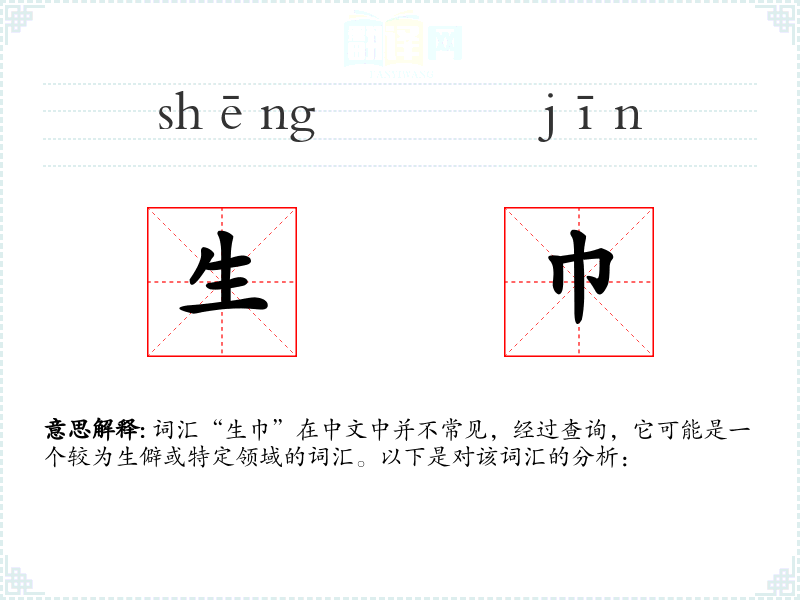词汇“生巾”在中文中并不常见,经过查询,它可能是一个较为生僻或特定领域的词汇。以下是对该词汇的分析:
