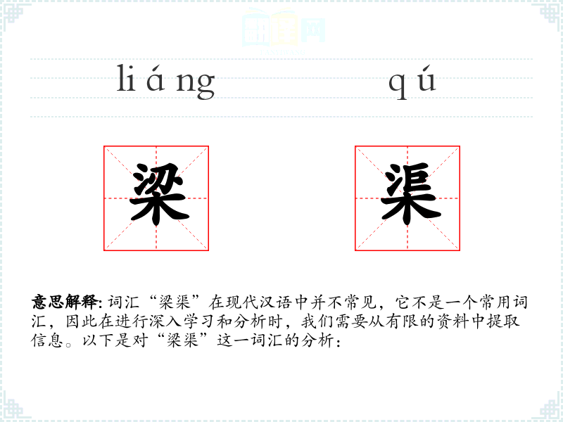 词汇“梁渠”在现代汉语中并不常见,它不是一个常用词汇,因此在进行深入学*和分析时,我们需要从有限的资料中提取信息。以下是对“梁渠”这一词汇的分析: