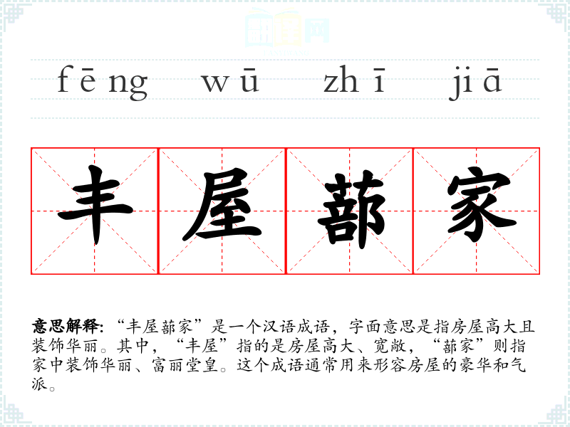 “丰屋蔀家”是一个汉语成语,字面意思是指房屋高大且装饰华丽。其中,“丰屋”指的是房屋高大、宽敞,“蔀家”则指家中装饰华丽、富丽堂皇。这个成语通常用来形容房屋的豪华和气派。