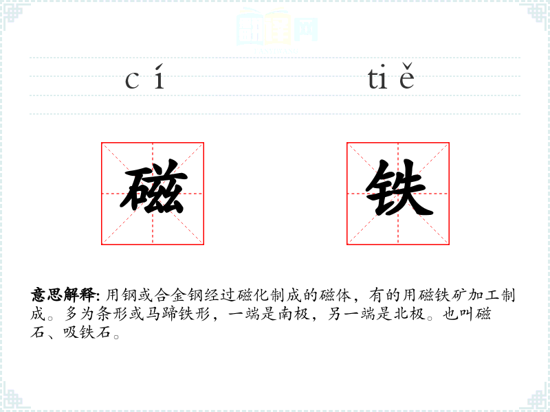 用钢或合金钢经过磁化制成的磁体,有的用磁铁矿加工制成。多为条形或马蹄铁形,一端是南极,另一端是北极。也叫磁石、吸铁石。