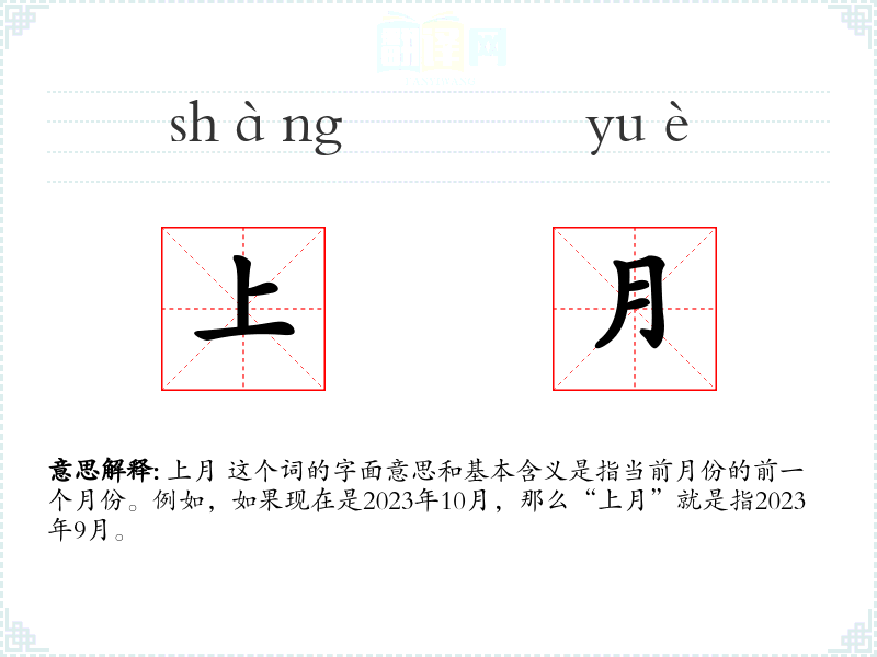 上月 这个词的字面意思和基本含义是指当前月份的前一个月份。例如,如果现在是2023年10月,那么“上月”就是指2023年9月。
