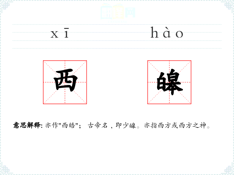 亦作"西皓"; 古帝名﹐即少皞。亦指西方或西方之神。