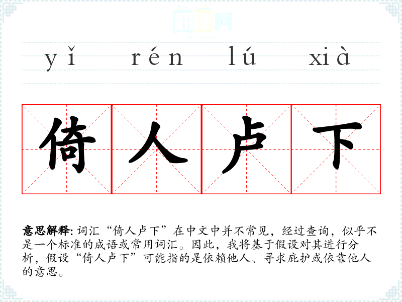 由于“倚人卢下”不是一个标准词汇,其词源和演变难以考证。假设它是由“倚”和“卢”两个字组合而成,可能是在特定语境下形成的表达。