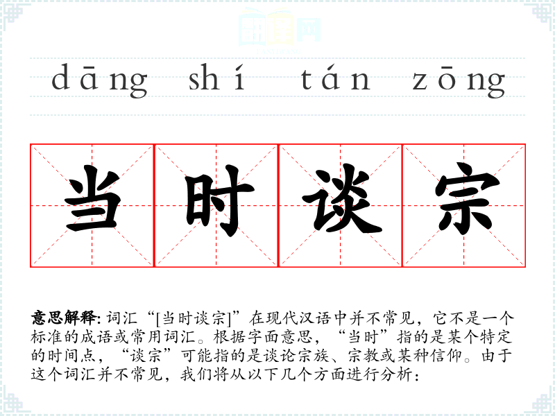 “当时谈宗”这个词汇虽然不常见,但它反映了特定时间点和语境下人们对宗族或*话题的重视。在语言学和表达中,了解这样的词汇可以帮助我们更好地理解特定文化和历史背景下的语言使用。