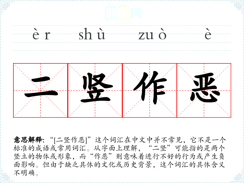 “[二竖作恶]”这个词汇在中文中并不常见,它不是一个标准的成语或常用词汇。从字面上理解,“二竖”可能指的是两个竖立的物体或形象,而“作恶”则意味着进行不好的行为或产生负面影响。但由于缺乏具体的文化或历史背景,这个词汇的具体含义不明确。
